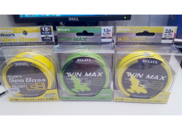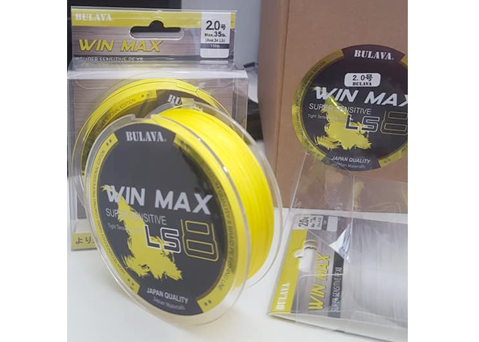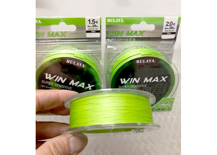 8.Model: BULAVA WIN MAX LS8-150M; Size (mm): #1.5; Dài (m): 150m; Braid: 8; Chịu tải (lb): 28lb; Màu sắc: Vàng; Giá bán: 350.000VNĐ.